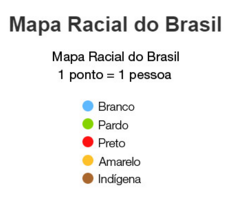 A primeira coisa que salta aos olhos quando se olha o país inteiro é a divisão entre um sul que se declara majoritariamente branco (pontos azuis) e o resto quase exclusivamente pardo (pontos verdes). A população negra (pontos vermelhos) se concentra em alguns pontos, principalmente na Bahia, enquanto populações indígenas predominam em regiões de fronteira, na Floresta Amazônica.