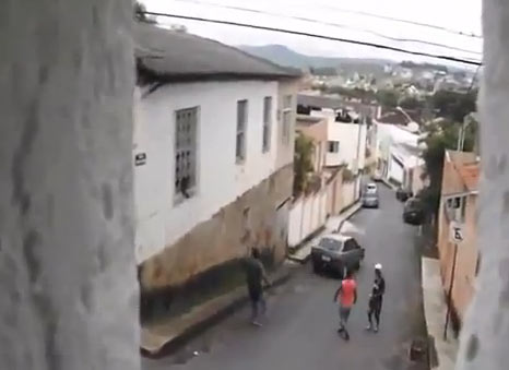 Três amigos tentam fazer um carro enguiçado pegar no tranco. Local escolhido: uma ladeira imensa.