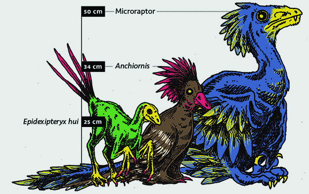 O microraptor, dentre os nanicos, é o que tem maior parte do esqueleto preservada. Este carnívoro viveu há 125 milhões de anos onde hoje fica a China e tinha uns 50 cm de comprimento (entre as pontas do rabo e da cabeça) e menos que 4 quilos – tipo um cachorro chihuahua. Na paleontogia, porém, é comum estimar a anatomia de espécies a partir de poucos fragmentos fósseis. Embora isto resulte em conclusões imprecisas, dá origem a outros candidatos a menor dino: o plumado chinês Anchiornis, com cerca de 150 milhões de anos, teria 34 cm e 110 gramas; o também chinês e plumado Epidexipteryx hui, 25 cm (45 cm contando a cauda) e 164 gramas.