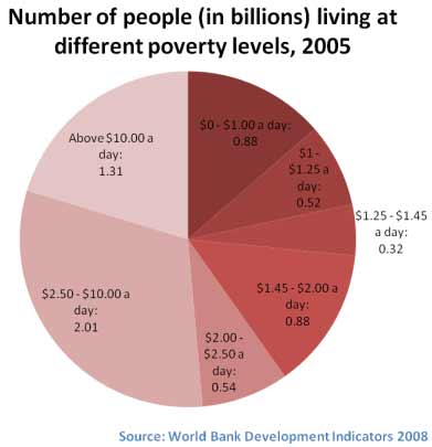 Independente da classificação de o que é pobreza, o Banco Mundial classifica que uma pessoa precisa de, pelo menos, US$ 1 por dia para conseguir sobreviver. É o mínimo necessário para se manter as necessidades básicas, como a alimentação. Porém, se for se considerar a inflação, esse número teria que subir um pouco mais, para US$ 1,45 com os dados de 2005. Como mostra a tabela em pizza acima, então, cerca de 1,72 bilhão de pessoas no mundo estão abaixo da linha de pobreza, segundo dados de 2008 do próprio banco.