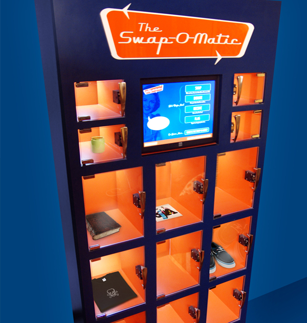 Esqueça as convencionais máquinas de venda automáticas, em que você precisa depositar dinheiro para retirar o produto que deseja. Com a Swap-O-Matic*, desenvolvida pela designer americana Lisa Fenequito, tudo funciona na base da troca: para conseguir um objeto que está dentro da máquina, você precisa depositar outro, que já não utiliza mais.