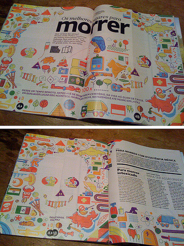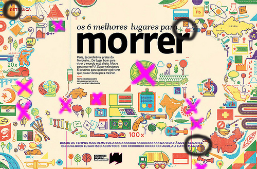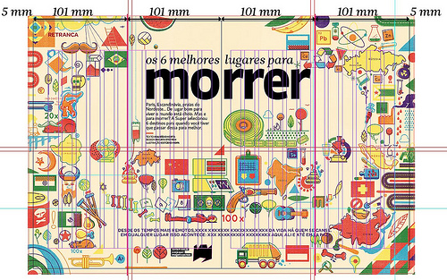 Foi então que o Versi sugeriu fazermos um catálogo de turismo, fazendo uma brincadeira com um título que poderia ser algo como “Conheça os melhores lugares para você morrer”. E a ilustração teria uma cara divertida, engraçada, mas depois, na segunda dupla, era pareceria macabra. Mas aí lembramos das dobradinhas da revista Mad.