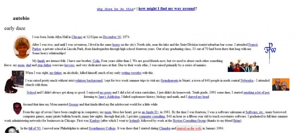 Em dezembro de 1993, o estudante Justin Hall, à época com 19 anos, encontrou um exemplar no jornal New York Times que falava sobre uma coisa nova chamada web. O primeiro site havia sido colocado no ar no ano anterior. “Gráficos e links para percorrer a Internet? Todo o conceito me surpreendeu. Logo após navegar na web, percebi que quase todos os esforços de publicação on-line foram amadores – feitos por pessoas que sabiam como usar HTML, mas não necessariamente tinham algo em particular a dizer”, conta ele em sua página. Então ele resolveu aprender HTML buscando informações na internet para criar seu próprio site, que se chamou inicialmente “Página Inicial do Justin”. Foi o primeiro blog já criado. Lá, havia links para informações HTML, uma foto dele com o coronel americano Oliver North, um clipe sonoro do vocalista do Jane’s Addiction louco de ácido e uma lista dos seus sites favoritos, além de alguns textos em que falava sobre a sua vida. Havia também uma página cor de rosa sobre sexo que trazia links como “Conselhos sexuais”, “Vitrines sexuais” e “Supermodelos disfarçadamente sexuais”, seja lá o que isso quisesse dizer. Tudo isso fez sucesso e Justin manteve o blog por 11 anos.