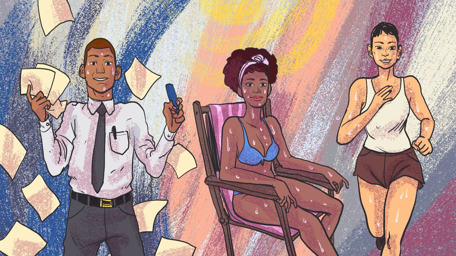 As écrinas estão distribuídas por todo o corpo e são ativas desde que nascemos. O suor que elas exalam não tem cheiro, porque é composto basicamente por água e sais minerais. Já as apócrinas ficam concentradas em algumas áreas específicas do corpo, como a virilha, o couro cabeludo e as axilas. São ligadas a regiões com pelos e secretam um suor que contém lipídios e aminoácidos.